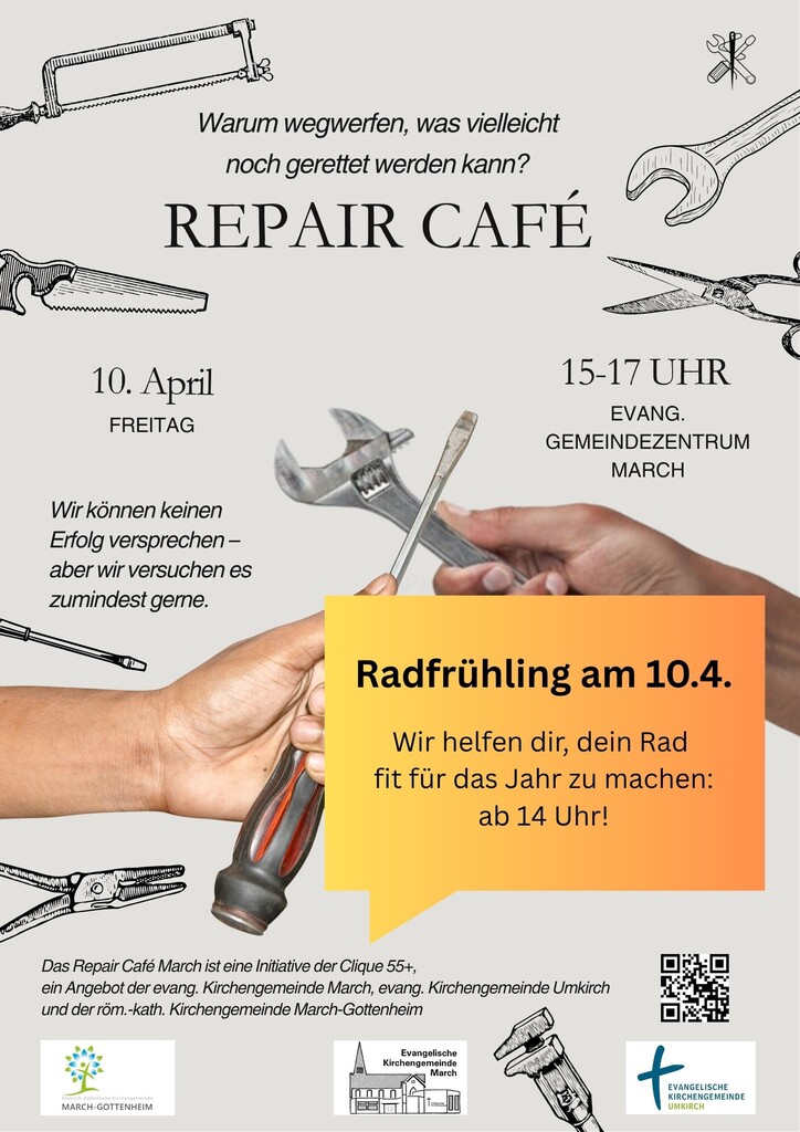 Am Freitag, 10. April unterstützt das Repaircafé alle, die ihr Fahrrad frühlingsfit machen wollen, beim Durchchecken und Einstellen des „Drahtesels“. Dazu öffnet es an diesem Termin schon um 14 Uhr seine Tore.